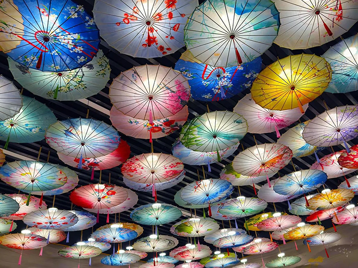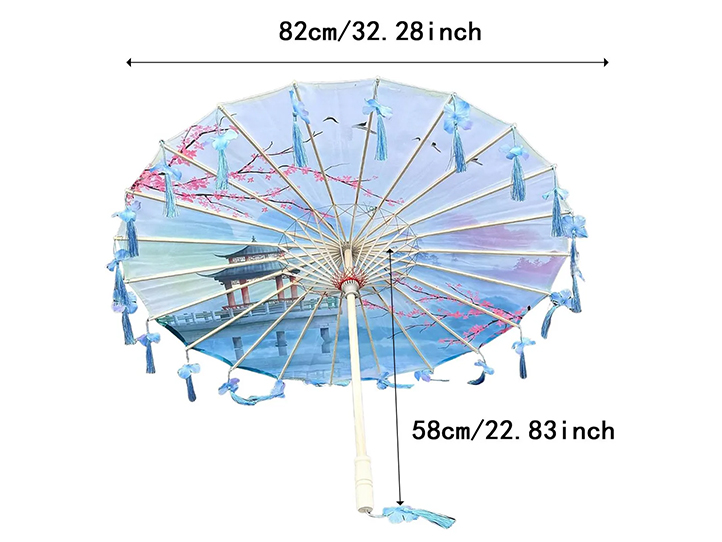Sombrilla china de tela con borlas