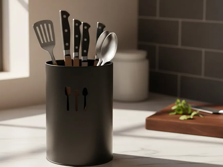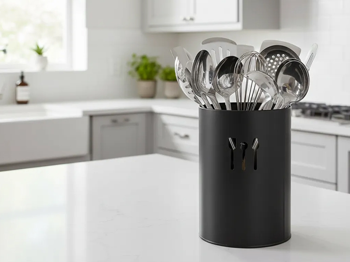 Cuenta con gran capacidad para organizar cucharones, espátulas, batidores, pinzas y más.