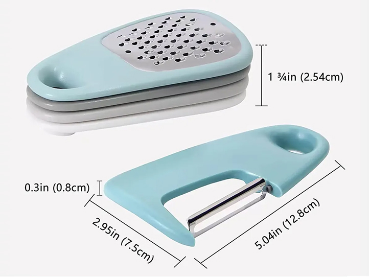 Utensilios de cocina esenciales en un kit compacto: pelador, corta pizza, rallador, abre latas, rallador manzana, nuez moscada etc