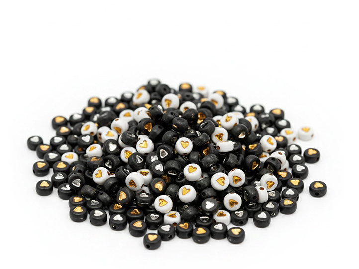 CUENTAS PLASTICAS PASTILLA NEGRA CORAZON DORADO 100gms (DB)