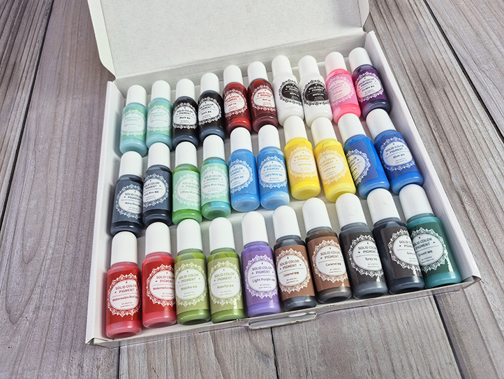 El pack contiene 30 frasquitos de 10ml cada uno con diferentes colores de pigmentos liquidos