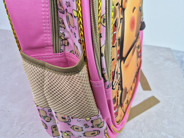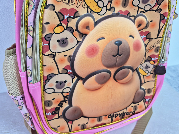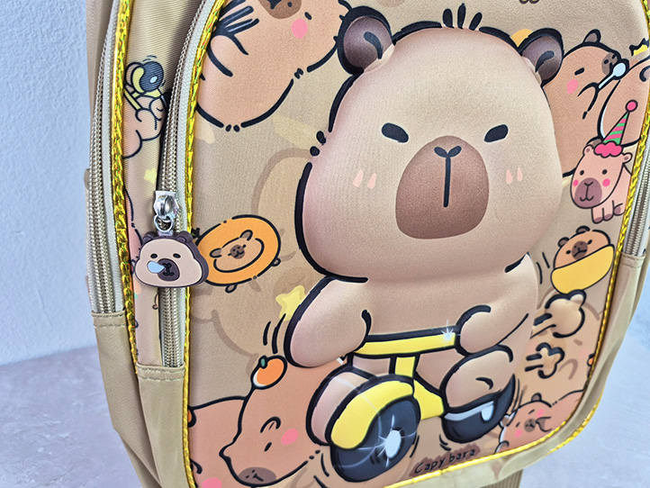 2 compartimientos principales grandes + 1 bolsillo frontal rigido con relieve capibara con tiracierre de goma de capibara