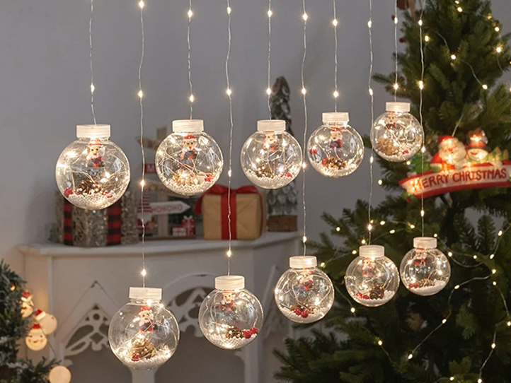 Guirnalda cortina led navideña esferas con nieve y decorativos.